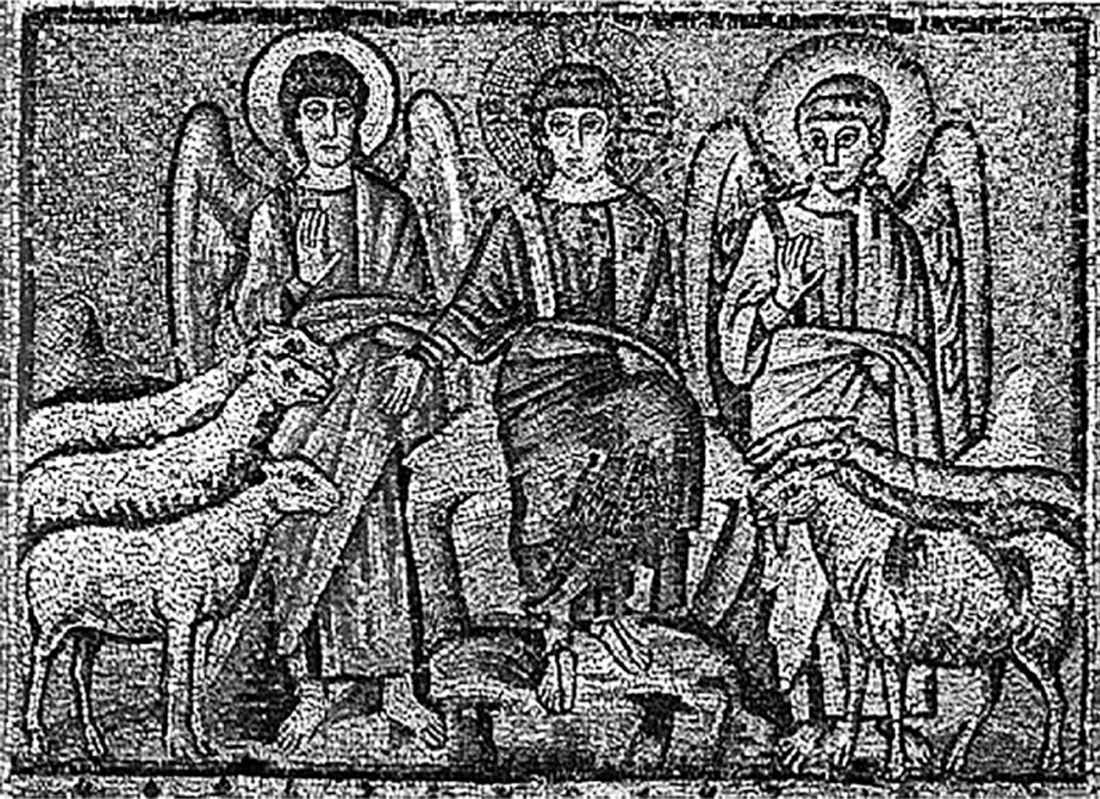 〈最後の審判(羊と山羊を分かつキリスト)〉6世紀初頭(サンタポリナーレ・ヌオーヴォ聖堂 ラヴェンナ):左の羊は善人のたとえ、中央がイエス、左の山羊は悪人のたとえ。