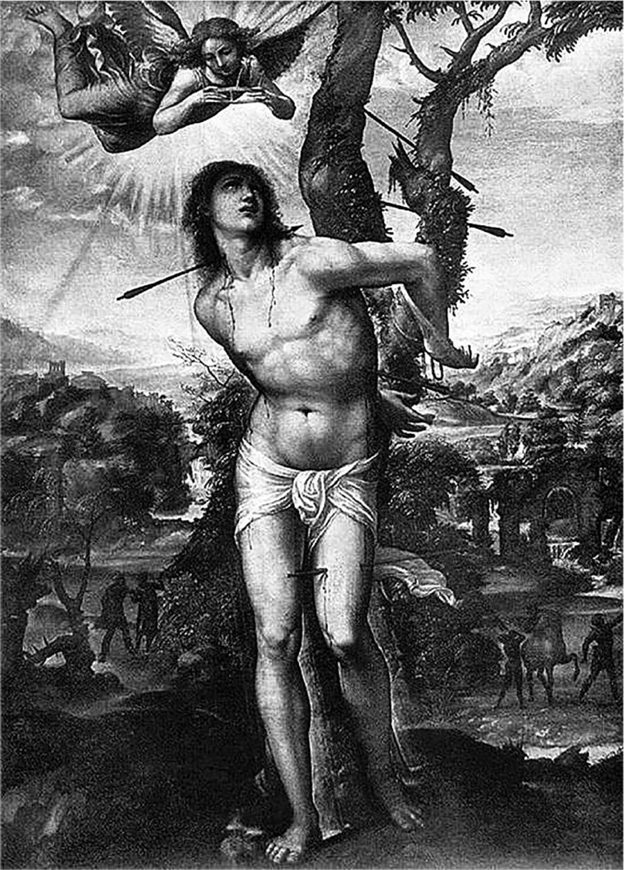 ソドマ 〈聖セバスティアヌス〉1525~26年(ピッティ美術館 フィレンツェ):セバスティアヌスは柱に縛り付けられている殉教の場面がよく描かれる。
