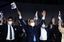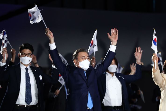 2020年8月15日、日本の植民地支配からの解放を記念する「光復節」の式典に出席し、万歳三唱をする韓国の文在寅大統領