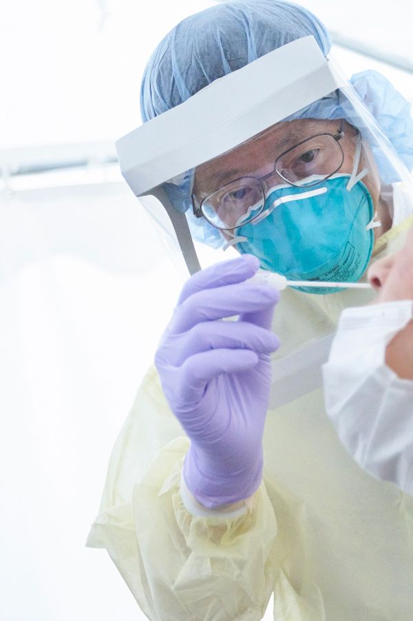 上灘紳子(かみなだ・のぶこ)/鳥取大学医療技術短期大学卒業後、1994年に看護部に入職。脳神経外科・耳鼻咽喉科病棟などを経て、2006年より感染制御部に配属。2007年に感染管理認定看護師資格取得。看護師長。千酌(写真右)とともに院内の警戒体制を指揮する。