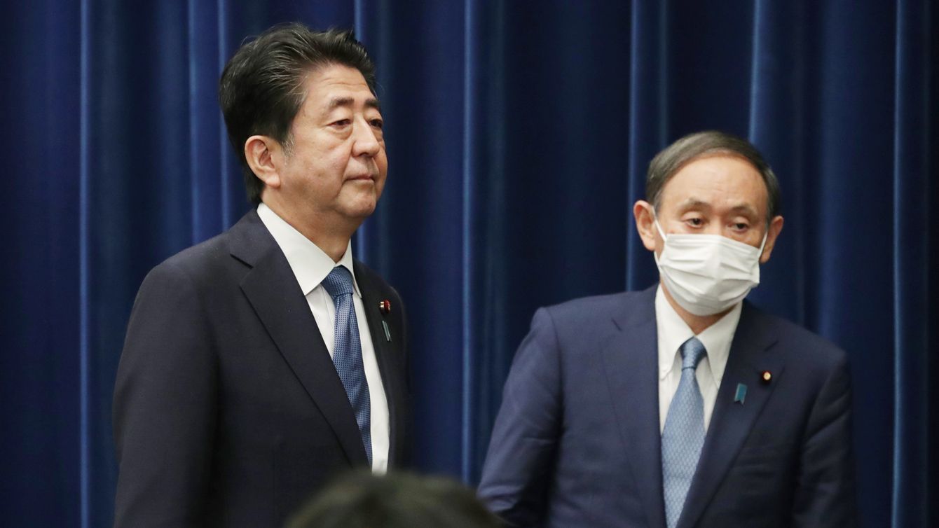 記者会見を終え、引き揚げる安倍晋三首相(左)。右は菅義偉官房長官=2020年8月28日午後、首相官邸