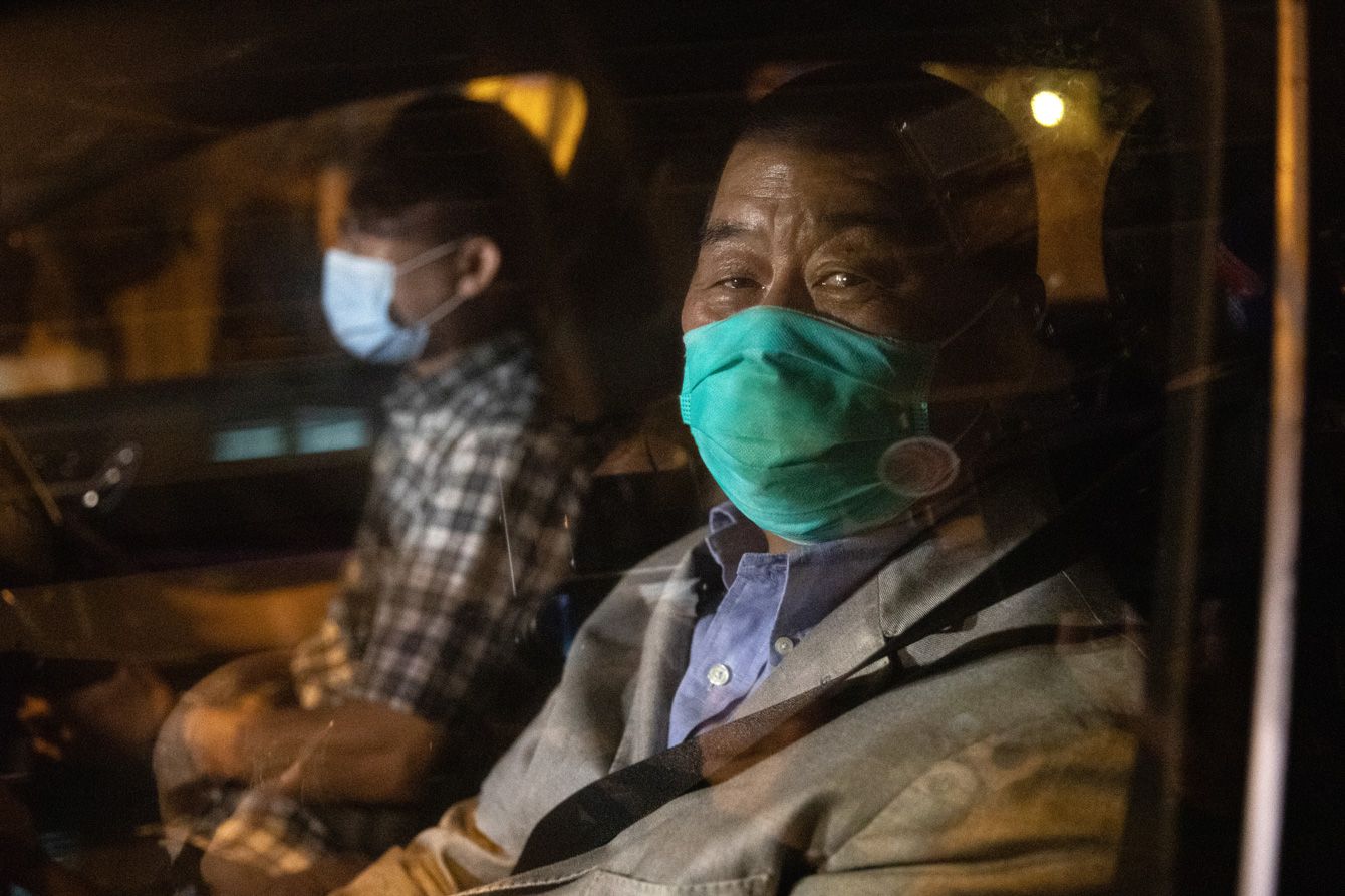 2020年8月12日、保釈され、車で警察署から去る香港紙「リンゴ日報」創業者の黎智英氏(中国・香港)
