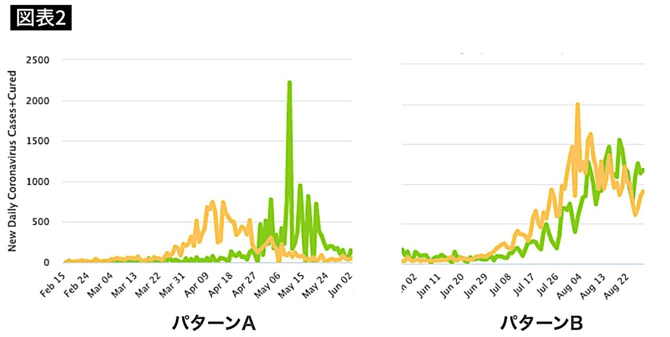 左がパターンA、右がパターンB(出典=Worldometer Japan coronavirus)