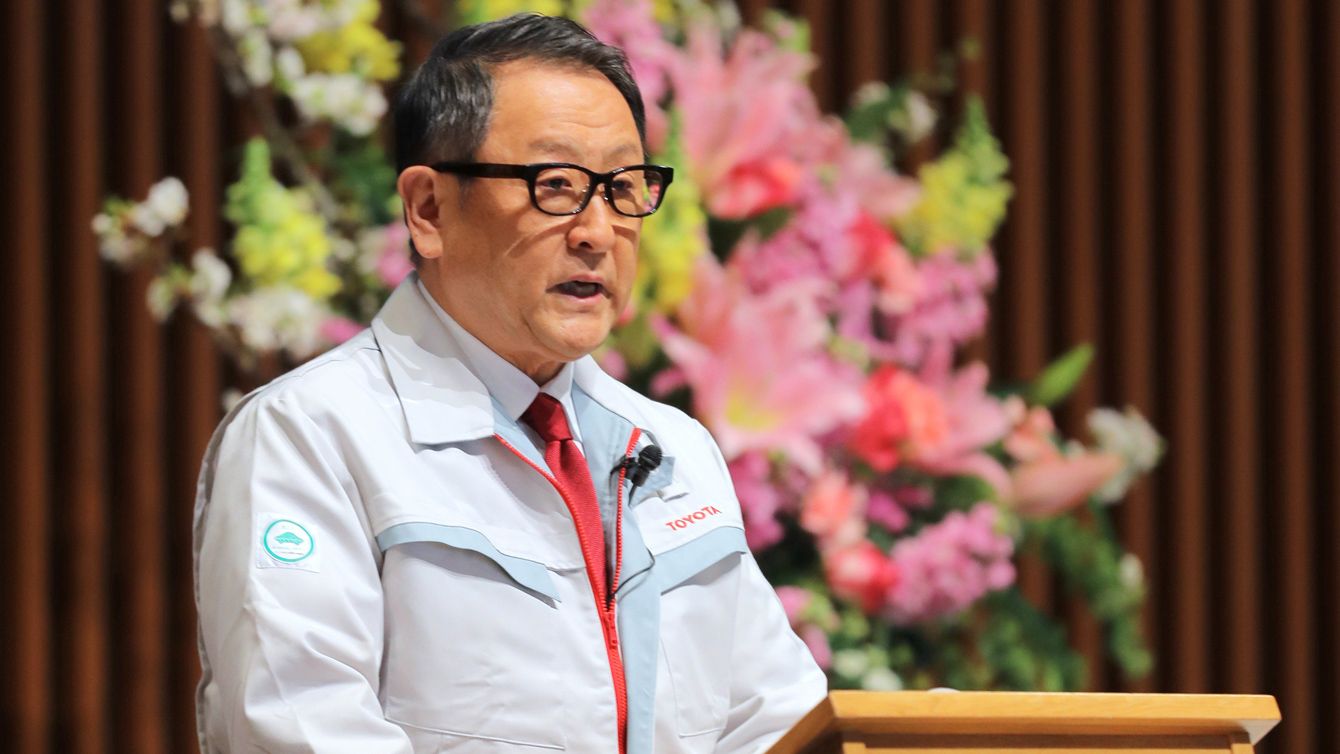 トヨタ自動車の入社式で、新入社員を前にあいさつする豊田章男社長=2019年4月1日、愛知県豊田市の同社本社