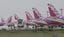 駐機する格安航空会社(LCC)ピーチ・アビエーションの機体の尾翼=2020年6月5日、関西国際空港