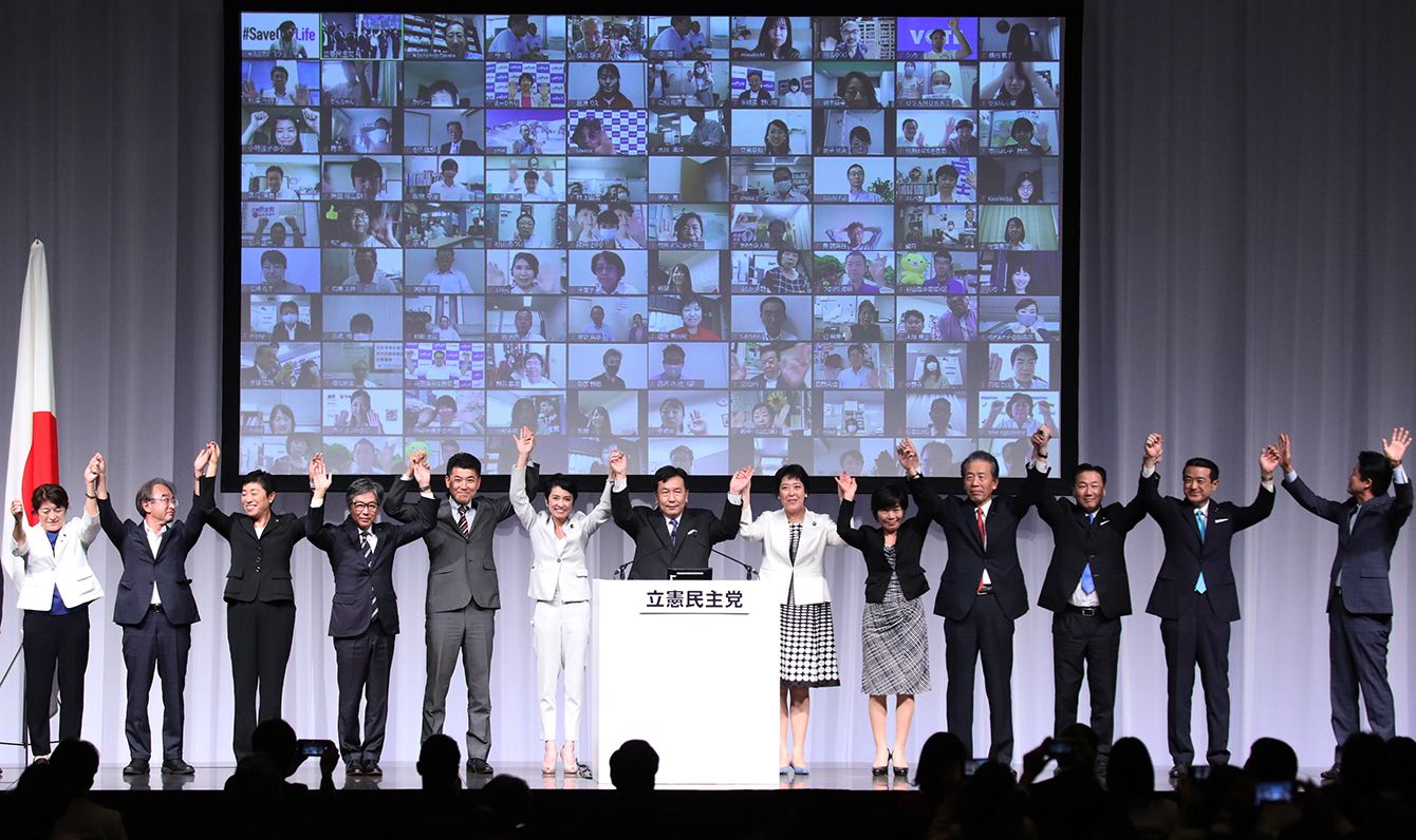 新党「立憲民主党」の結党大会でポーズを取る枝野幸男代表(中央)ら=2020年9月15日、東京都港区
