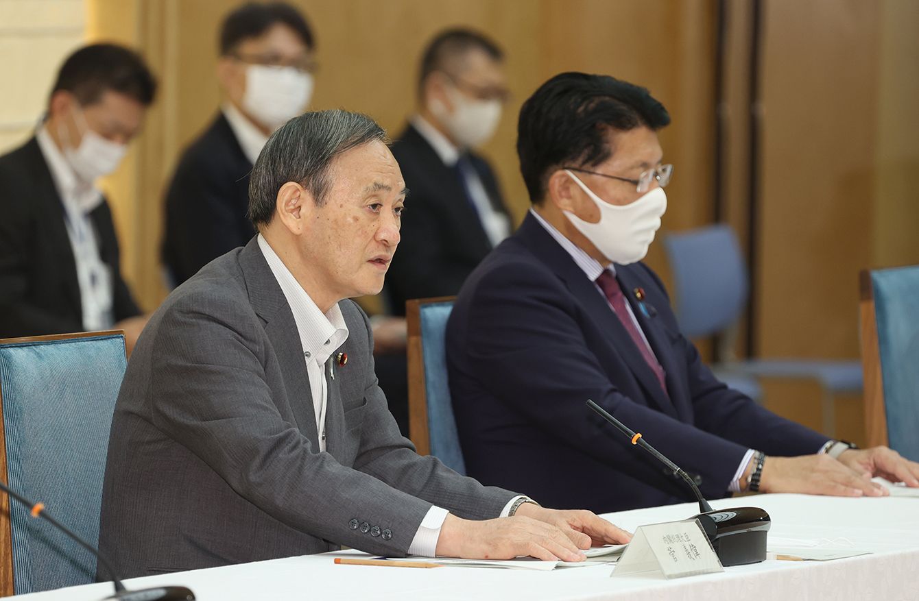 デジタル改革関係閣僚会議で発言する菅義偉首相(左)。右は平井卓也デジタル改革担当相=2020年9月23日、首相官邸