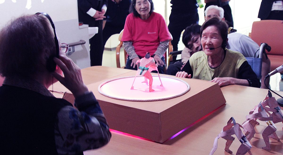 トントンボイス相撲は、トントンという声で紙相撲力士を戦わせるスポーツ。プレーヤーは自然と大きな声をたくさん出すので、喉の機能回復につながる。