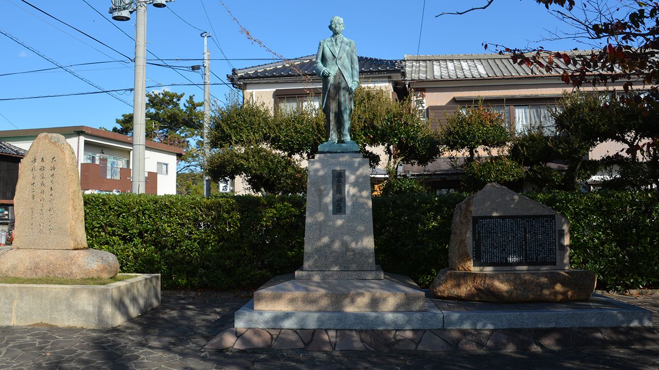 姫島村の風景。藤本昭夫村長の前任で父でもある熊雄氏の銅像が立つ