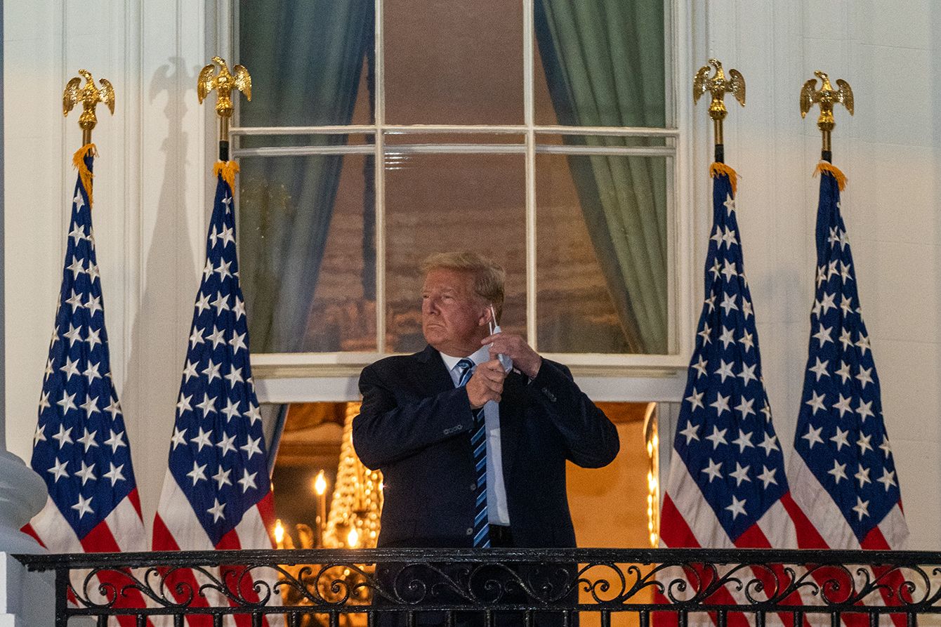退院しホワイトハウスに戻ってきたトランプ大統領=2020年10月5日