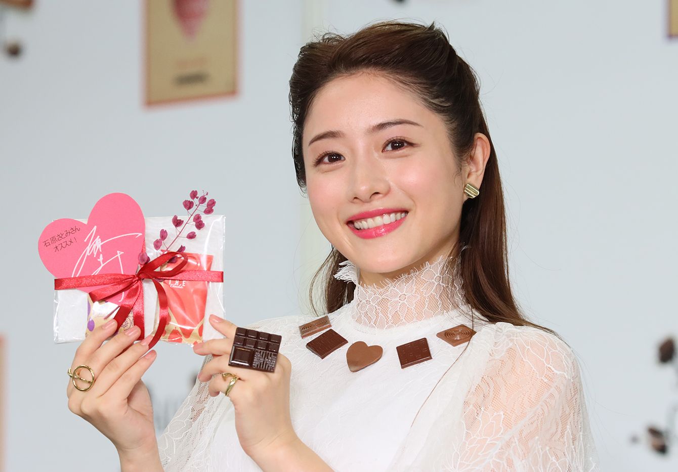 チョコレートの祭典「サロン・デュ・ショコラ2020」の前夜祭に出席した女優の石原さとみさん。本物のチョコレートをあしらった白いドレスで登場した=2020年1月25日、東京都