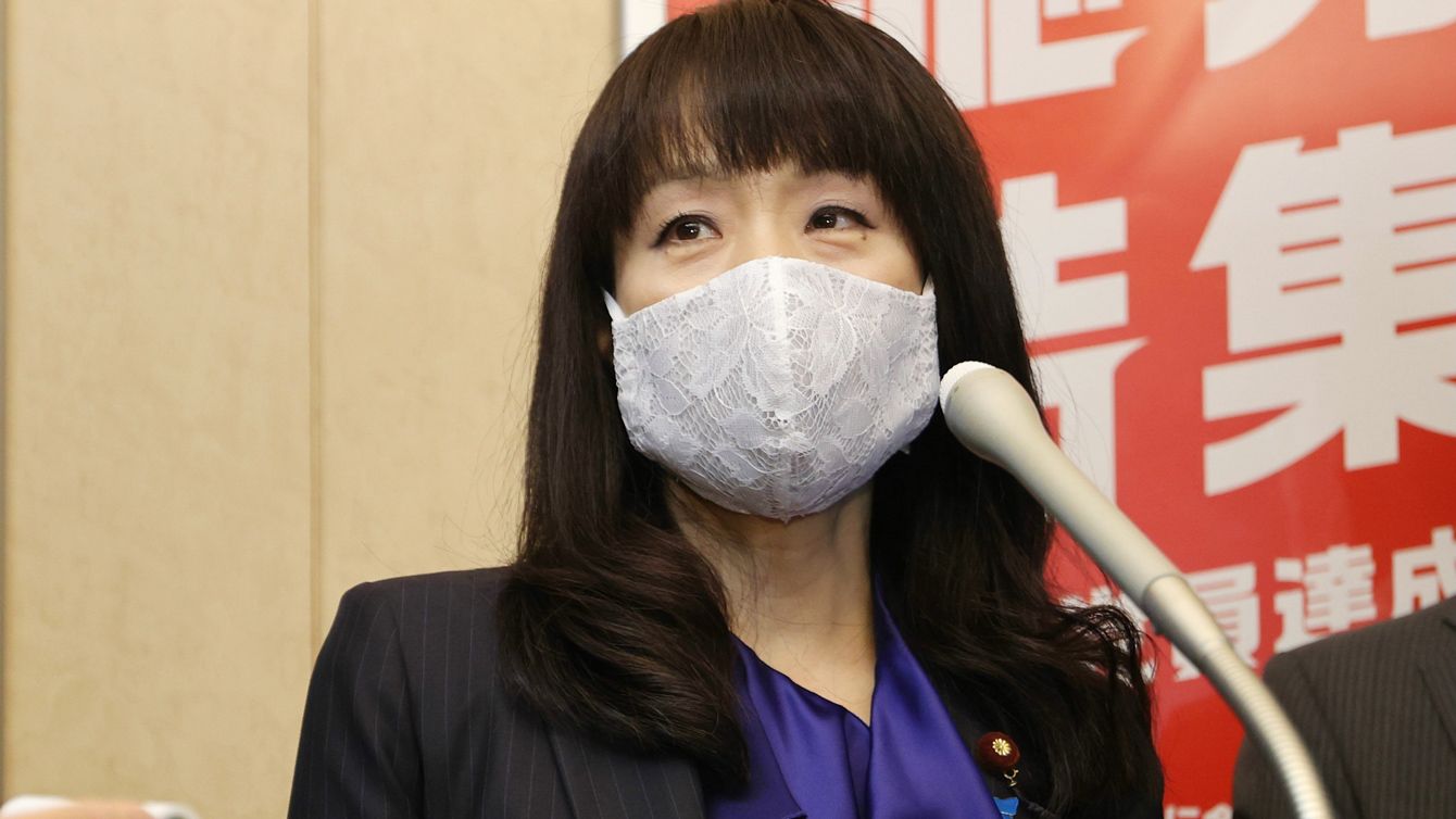 記者団の取材に応じる自民党の杉田水脈衆院議員=2020年9月30日、東京・永田町の同党本部