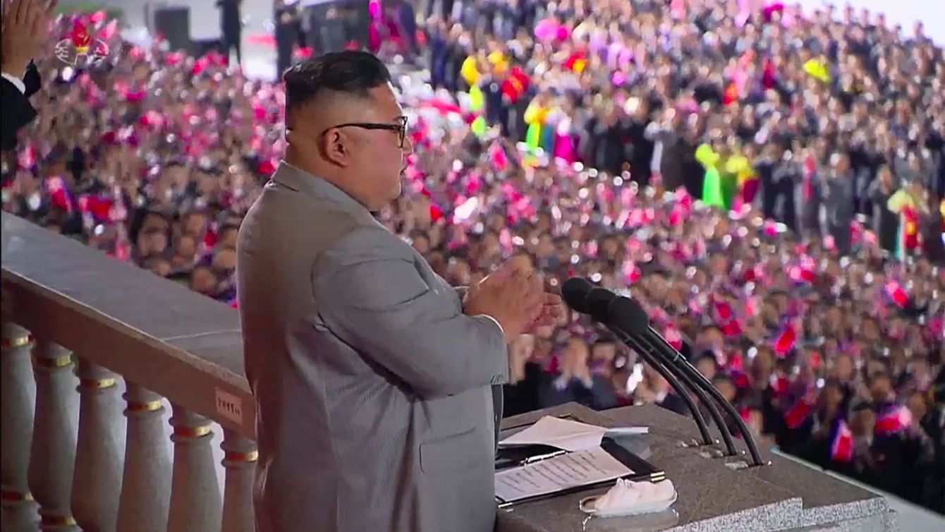 2020年10月10日、平壌で、軍事パレードに際し演説する北朝鮮の金正恩朝鮮労働党委員長[朝鮮中央テレビの映像より]