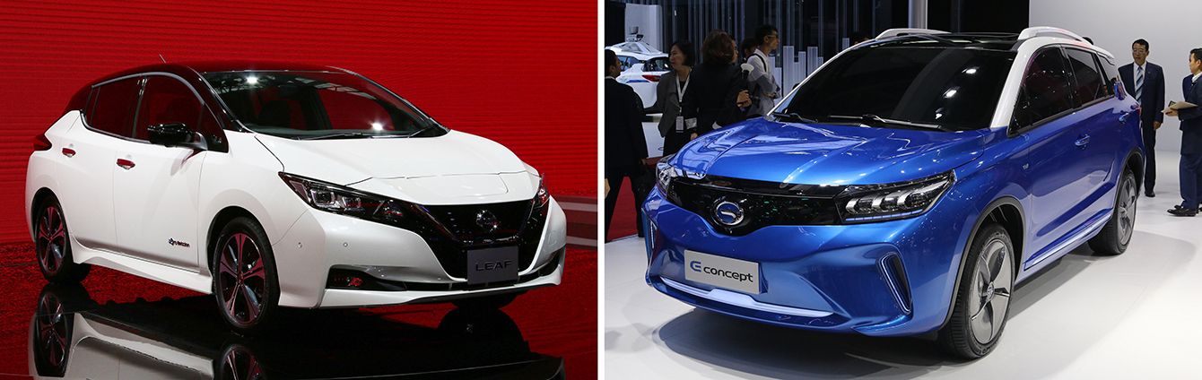 広州モーターショーに出展された日産自動車のリーフ(左)とトヨタ自動車のコンセプト車=2017年11月17日、中国・広東省広州市