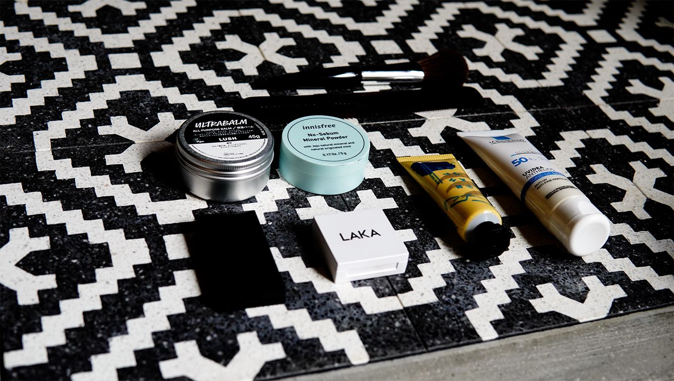 鎌塚さんのコスメ。平日はマットな質感の化粧下地を、休日はツヤ感のあるものを使い分けている。