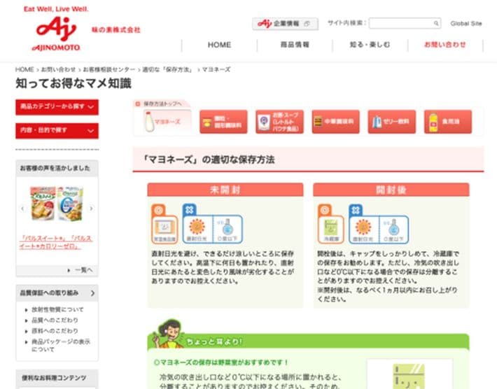 味の素お客様相談センターのページ。開封後の保存方法について、冷蔵庫のどこに入れたらよいか、どんな色になったら使用をやめるべきかなど、ていねいに解説している