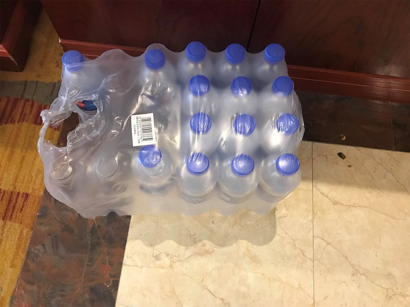 最初に支給された水は14日間で500ml×6本のみ。交渉後、追加で24本が支給された。