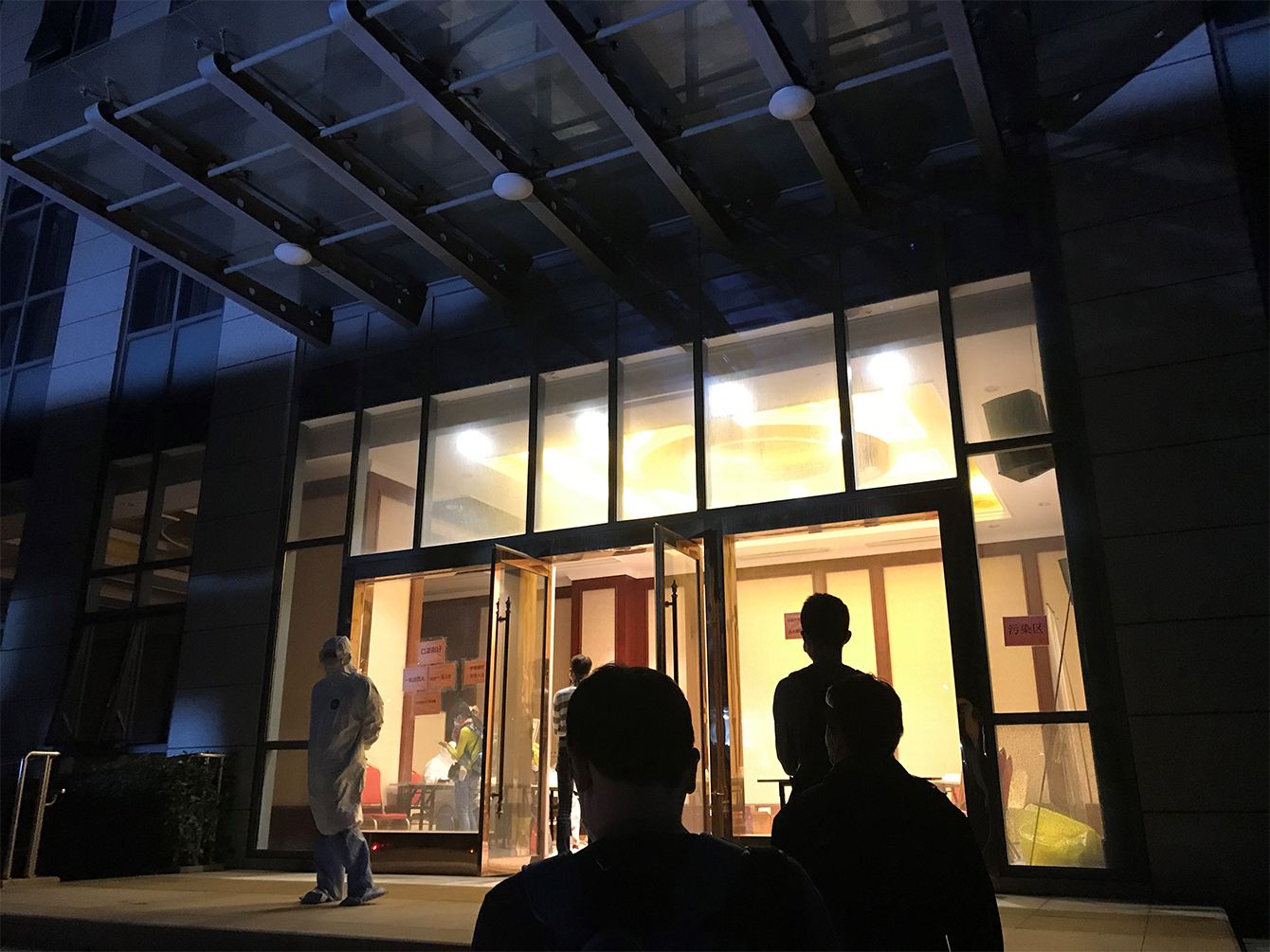 隔離先となったホテル。ドアには「マスク着用」「ソーシャルディスタンスの確保」「建物へは4人ずつ入るように」と細かい指示が張り出されている。