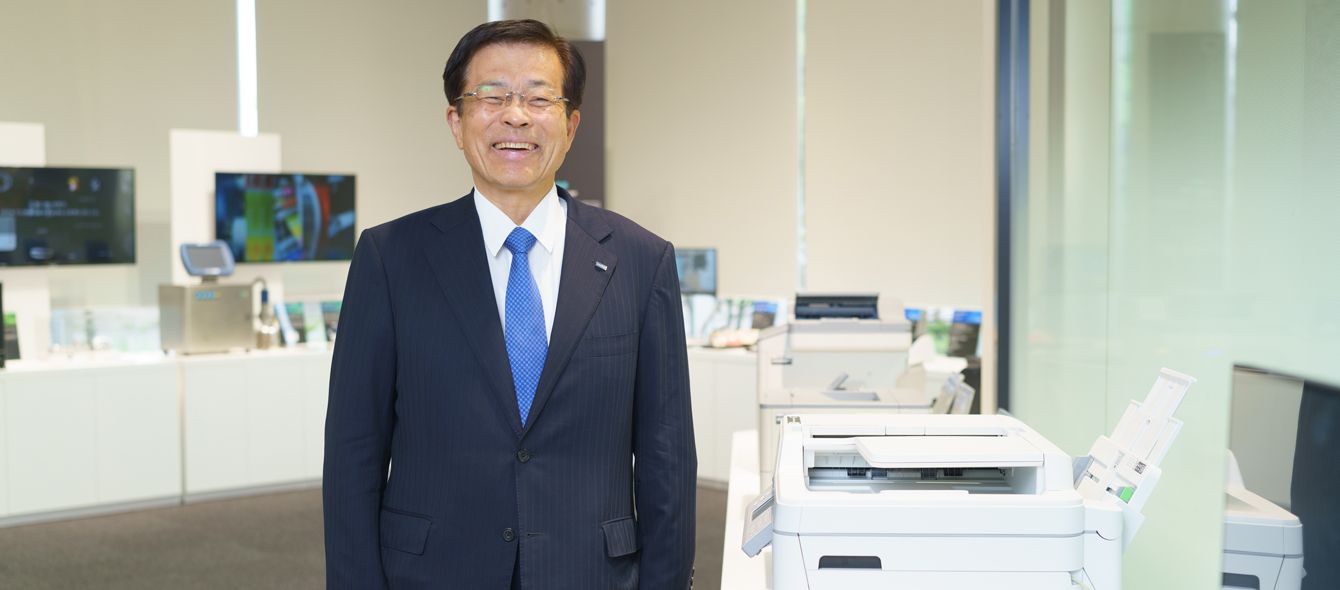 アメリカの販売会社時代にPC用のプリンターで販路を拡大した。小池会長が立っているのが、当時販売していたプリンター。
