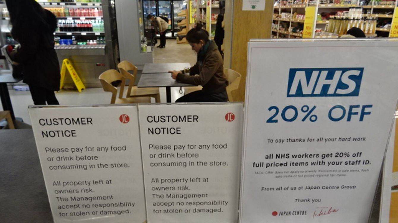 ロンドン市内の日本食料品店にある表示。「NHS職員は2割引き」と書かれている。