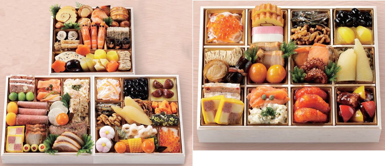 (左)「八百彦本店 和洋三段重(冷蔵)」/(右)「八百彦本店 和洋中一段重(冷蔵)」。ファミマのおせちは、今年から店頭受け取りか宅配かを選択できるようになった