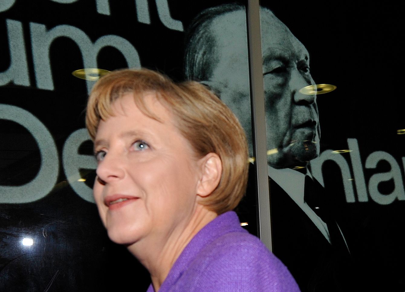CDU党本部にあるアデナウアー元首相の写真の前を通るメルケル首相(2009年9月28日)