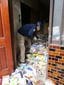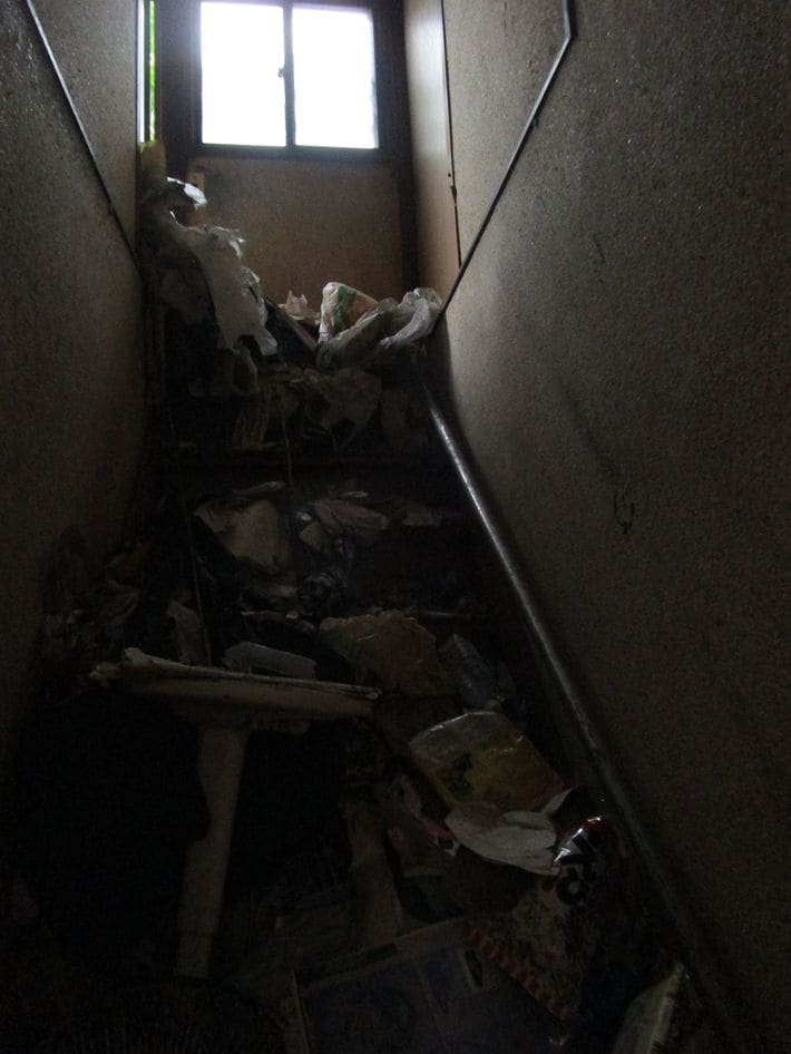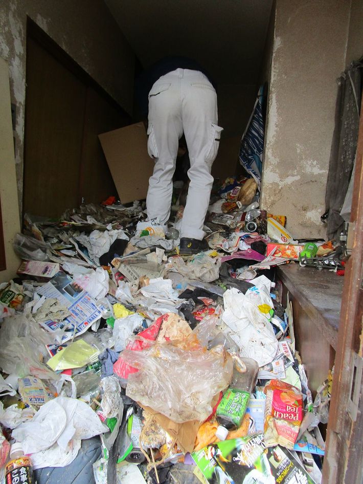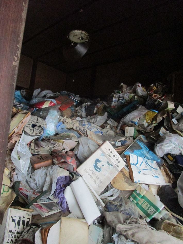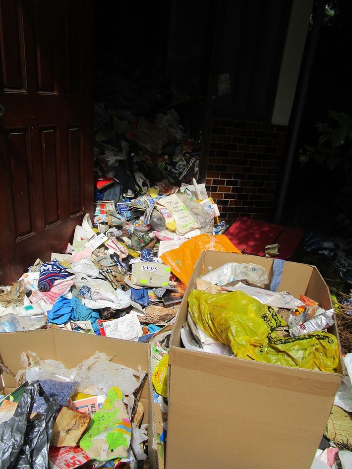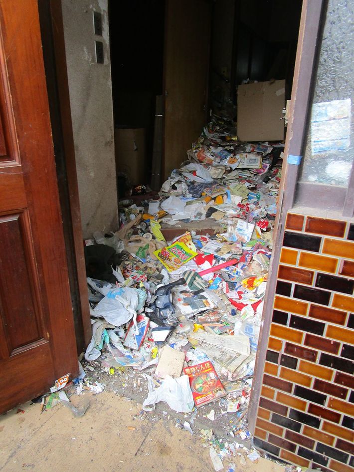 玄関にゴミがうずたかく積まれているので、まずはそれをかきだす。(撮影=笹井恵里子)