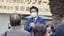 首相辞任後初めての帰郷で、支援者を前に演説する安倍晋三前首相(中央)と昭恵夫人(右奥)=2020年11月1日、山口県長門