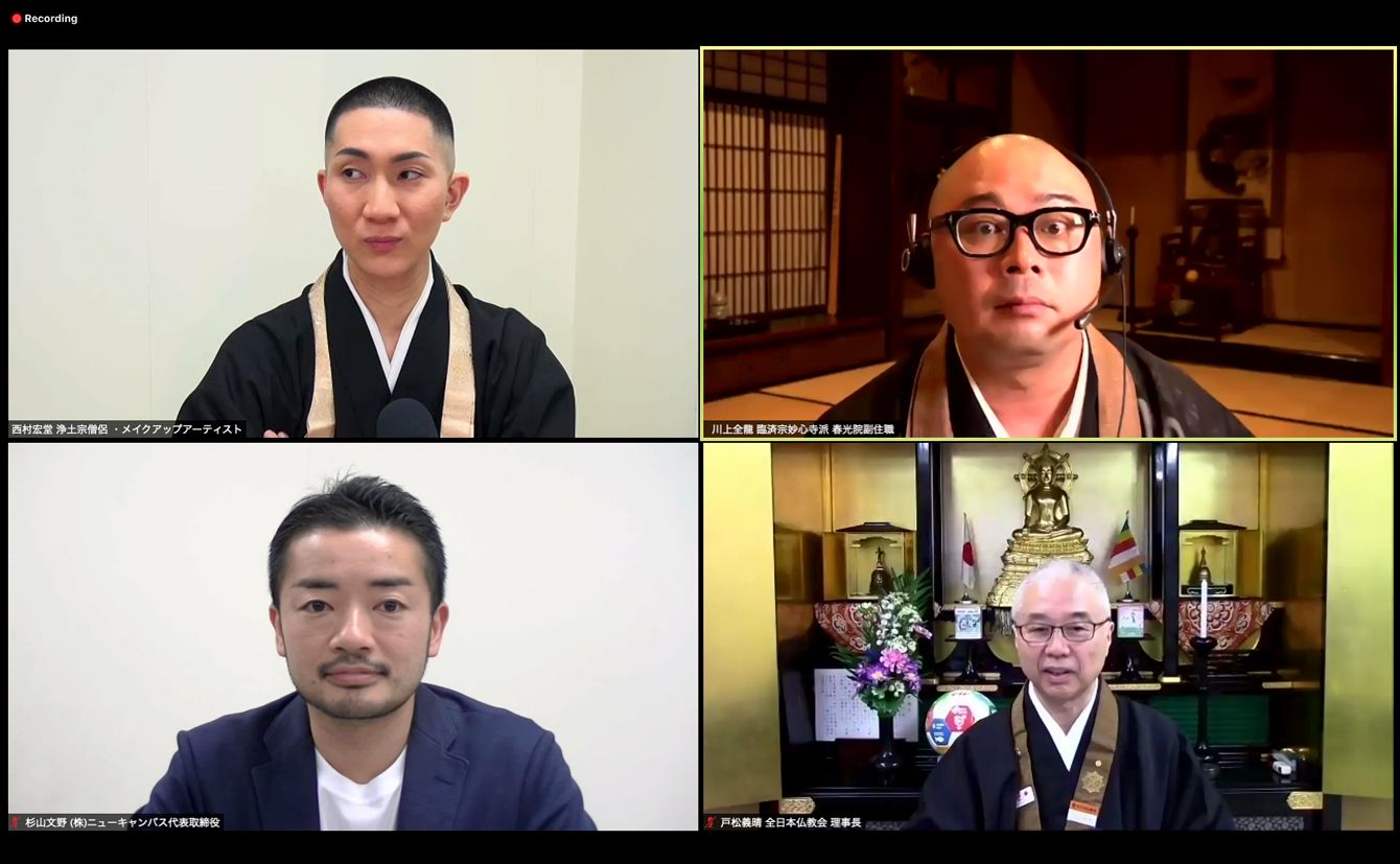 オンラインシンポジウムに登壇した4人。左上から時計回りに、西村宏堂さん(浄土宗僧侶、メイクアップアーティスト)、川上全龍さん(臨済宗妙心寺派僧侶)、戸松義晴さん(全日本仏教会理事長)、杉山文野さん(ニューキャンバス代表取締役、NPO法人東京レインボー)