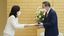 人事院の一宮なほみ総裁(左)から勧告を受け取る菅義偉首相=2020年10月7日、首相官邸