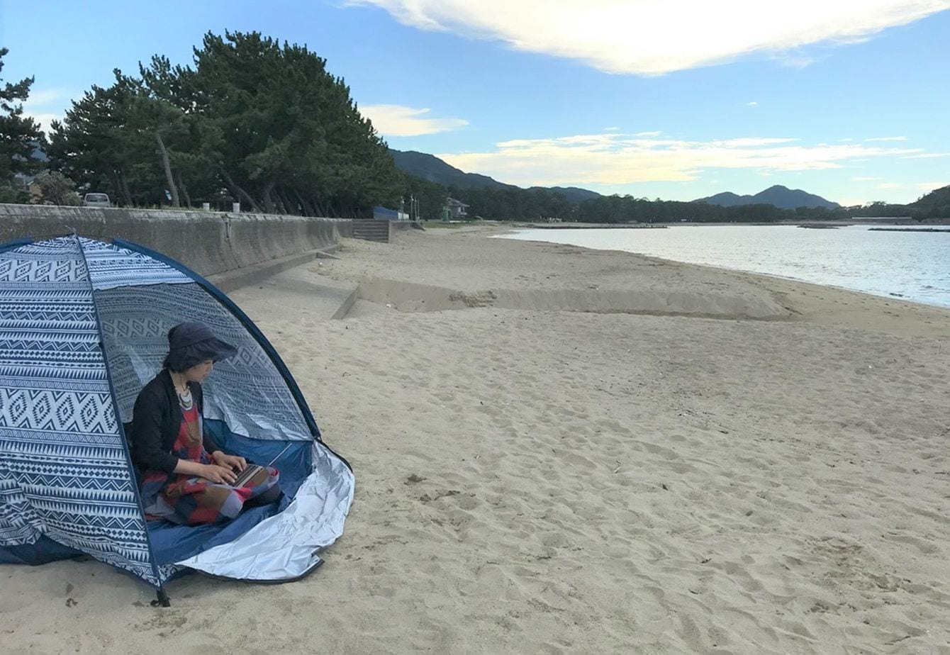 砂浜でPCワークを試みるも、集中できずに断念する筆者。(写真提供=筆者)