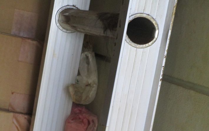こうしたゴミがエアコンの高さまで積み上がっていた。この日はあまりの暑さのため、連続した作業は10分が限界だった。(撮影=笹井恵里子)