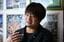 事務所のコンテナでインタビューを受ける中園栄一郎さん。壁には新聞記事が貼られていた。