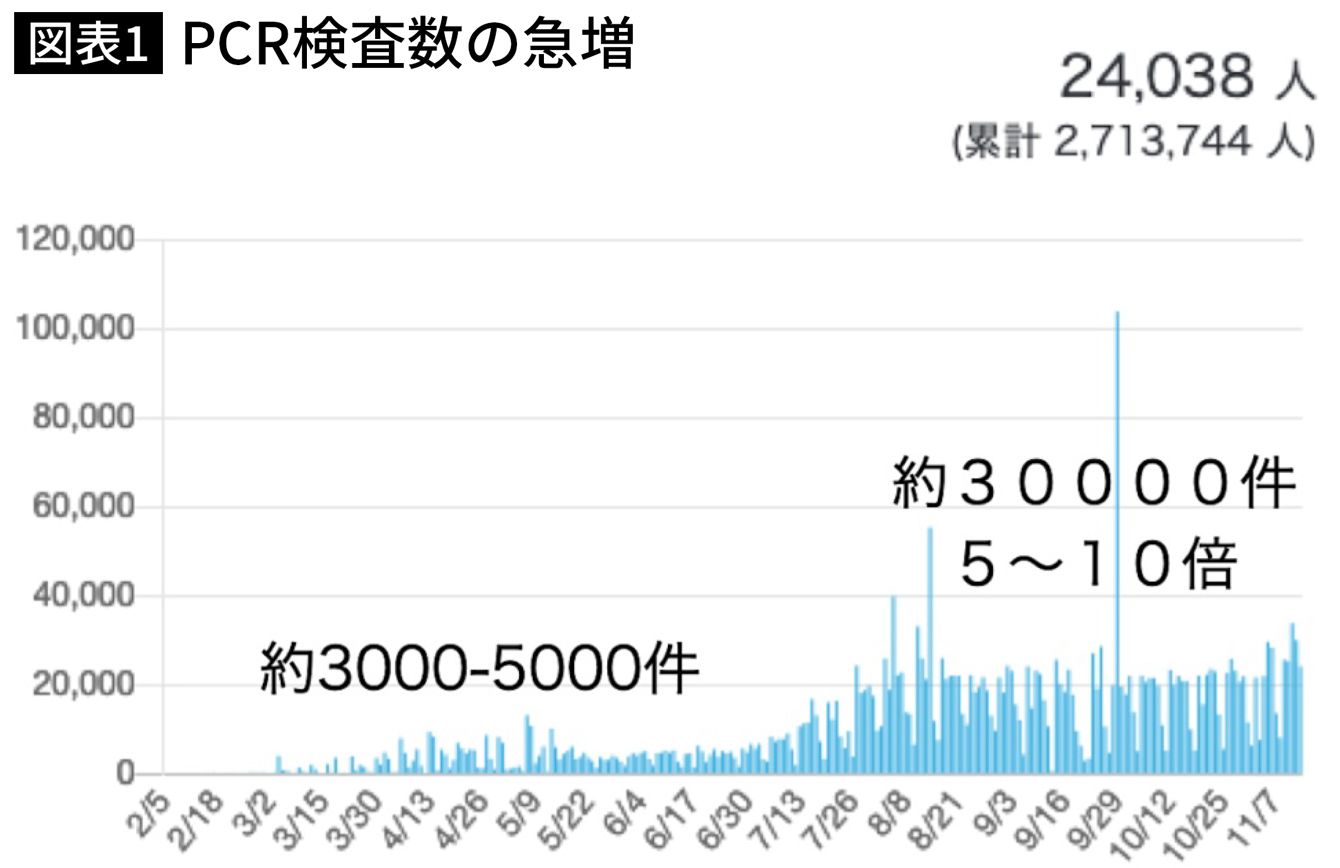 図表1PCR検査実施人数の変化(注5)(「厚労省 国内の発生状況など」に著者追記)Fig. 1 Changes in the number of individuals undergoing PCR tests