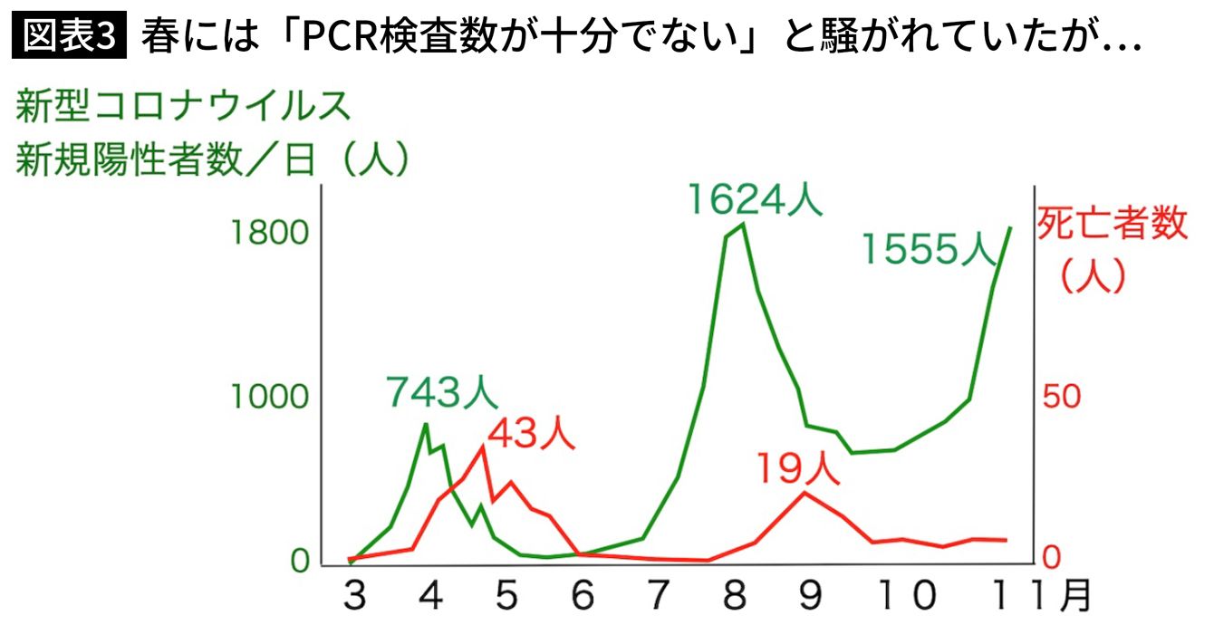 図表3.新型コロナウイルスの新規陽性者数と死亡者数(3月〜11月)(注1)