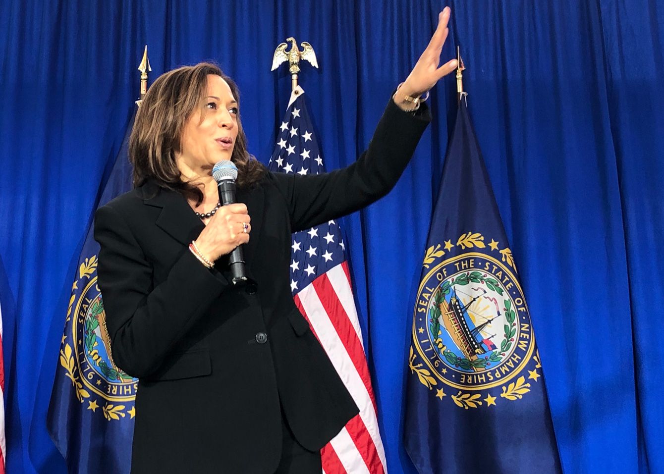 予備選中にニューハンプシャー州でスピーチするカマラ・ハリス