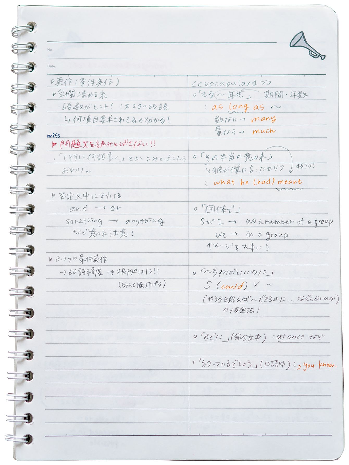 上田さんが実際に使っていた「間違いノート」。習得したいポイントだけに絞ってシンプルに書いていた。授業のノートもきちんと書くようにしており「塾のノートは後で見直せるように特にきれいに書いていました」。