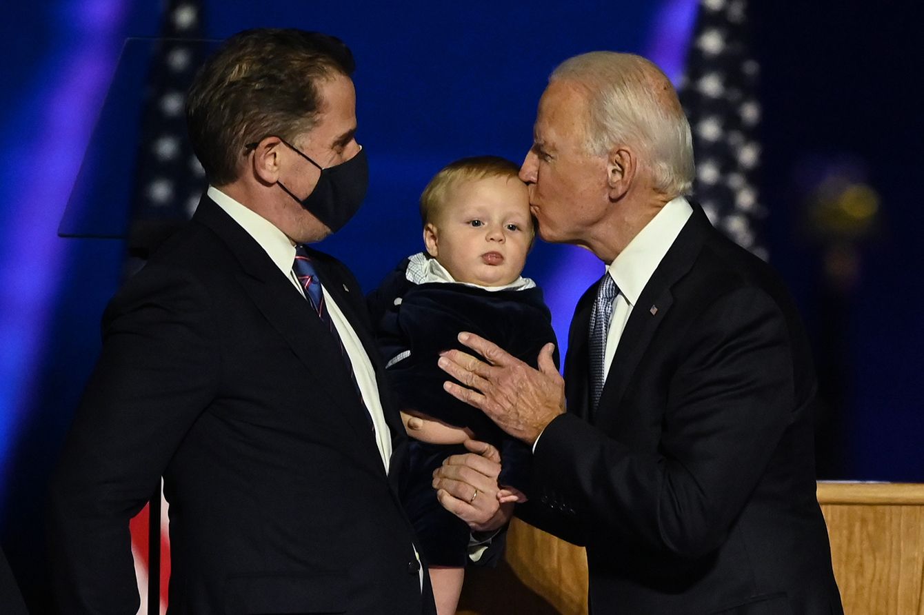 2020年11月7日、デラウェア州ウィルミントンで、息子のハンター・バイデン氏に抱かれた孫にキスをする米次期大統領ジョー・バイデン氏。