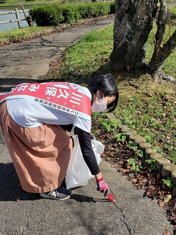 選挙運動中、息子を保育所に送る途中にゴミ拾いをする川久保皆実さん(写真提供=本人)