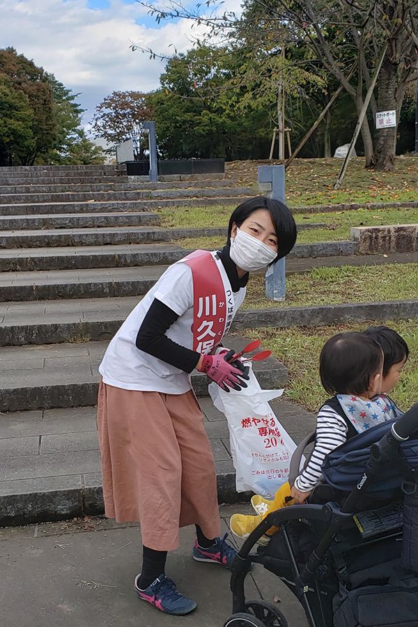 選挙活動(ゴミ拾い)中の川久保さん(写真提供=本人)