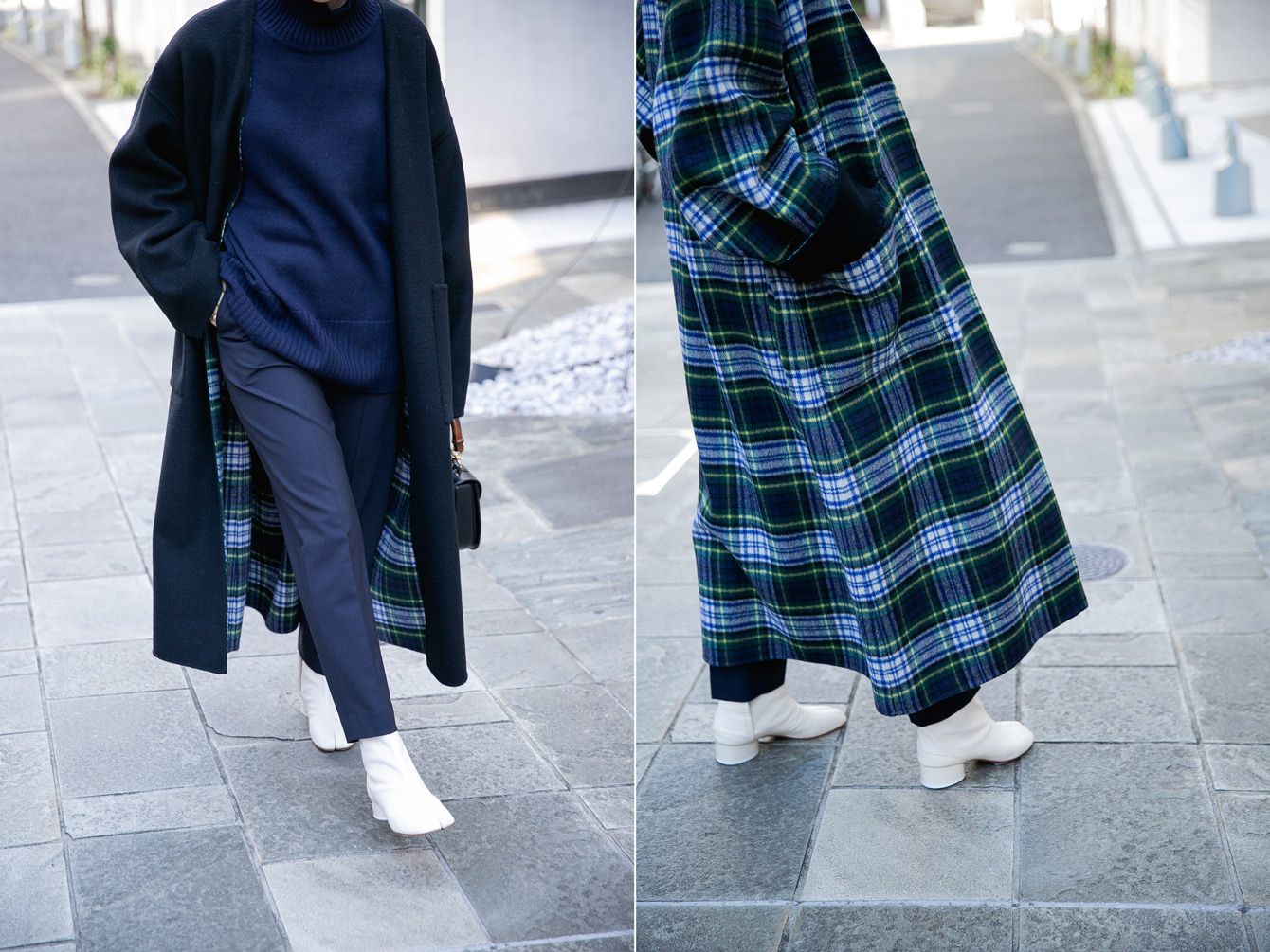 シンプルなブラックの無地と、カジュアルなチェック柄のリバーシブル。ほんのり起毛した上質なウール素材は着心地も抜群! すっきりとしたノーカラーで、合わせるインナーの襟を選ばない。共布のベルト付き。コート6万円/カレンソロジー(カレンソロジー 青山)