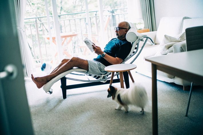 窓側に足が向くように写真の椅子に座りながら日々の読書をすることが多いという。取材時には愛犬の「お蝶さん」の姿も