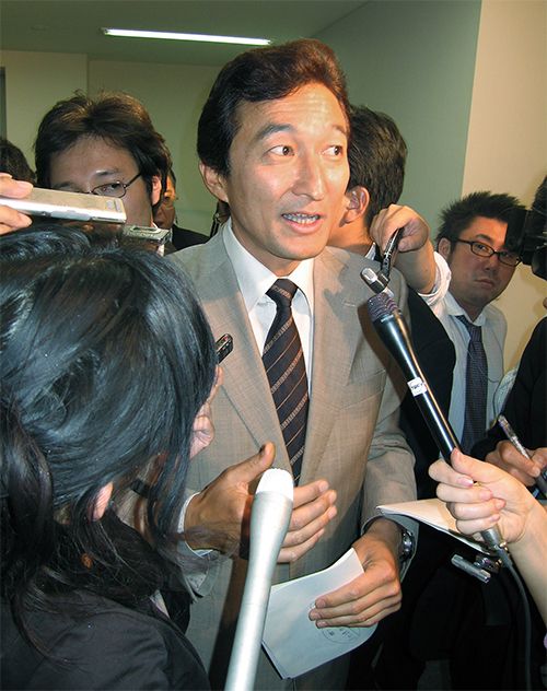 グッドウィル・グループからの全介護事業引き受けについて会見後、記者団の質問に答えるワタミの渡辺美樹社長(東京・大田区のワタミ本社)=2007年6月18日(写真=時事通信フォト)
