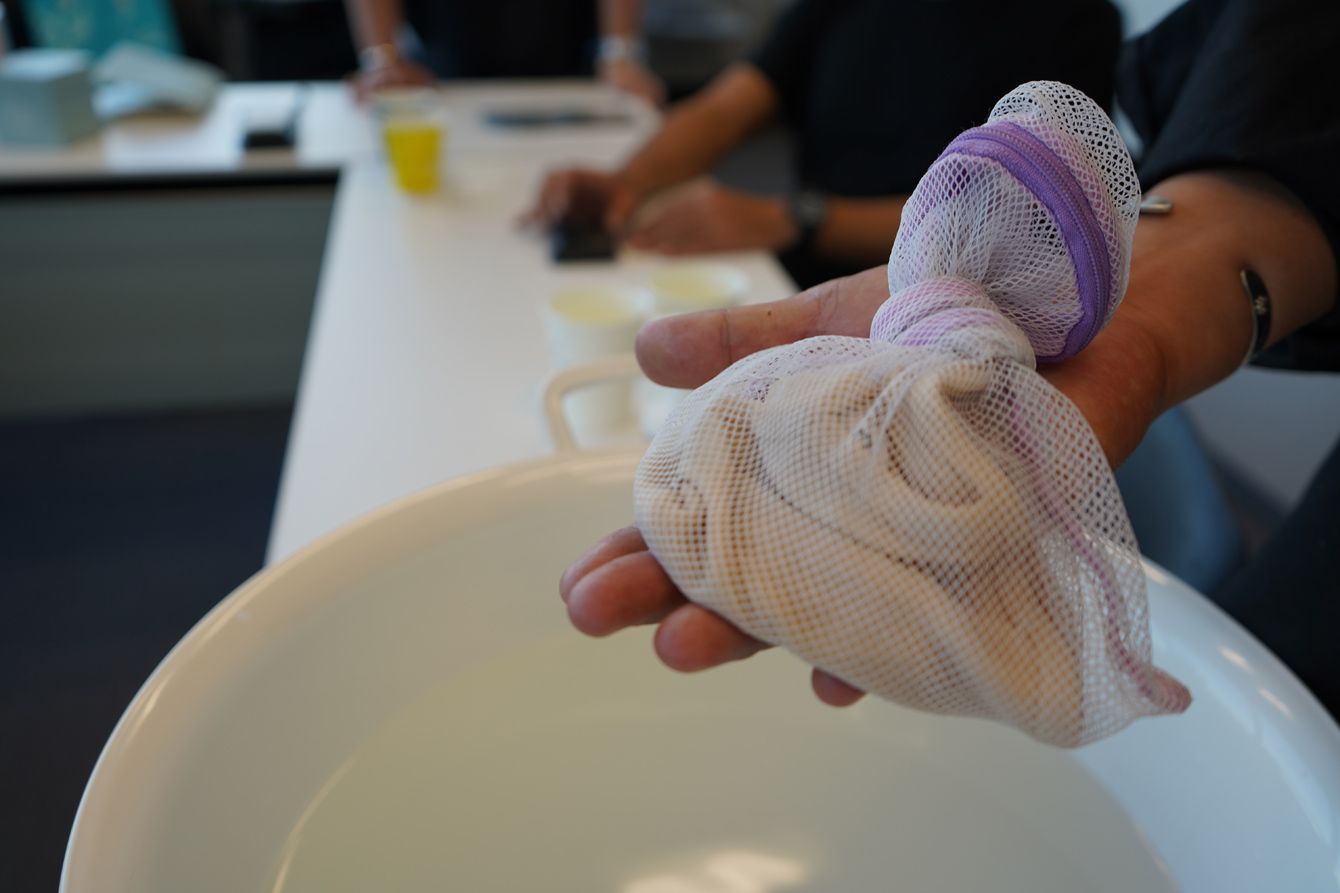 洗濯ネットにマスクを入れ、ネットを結んでマスクが動かないように固定する