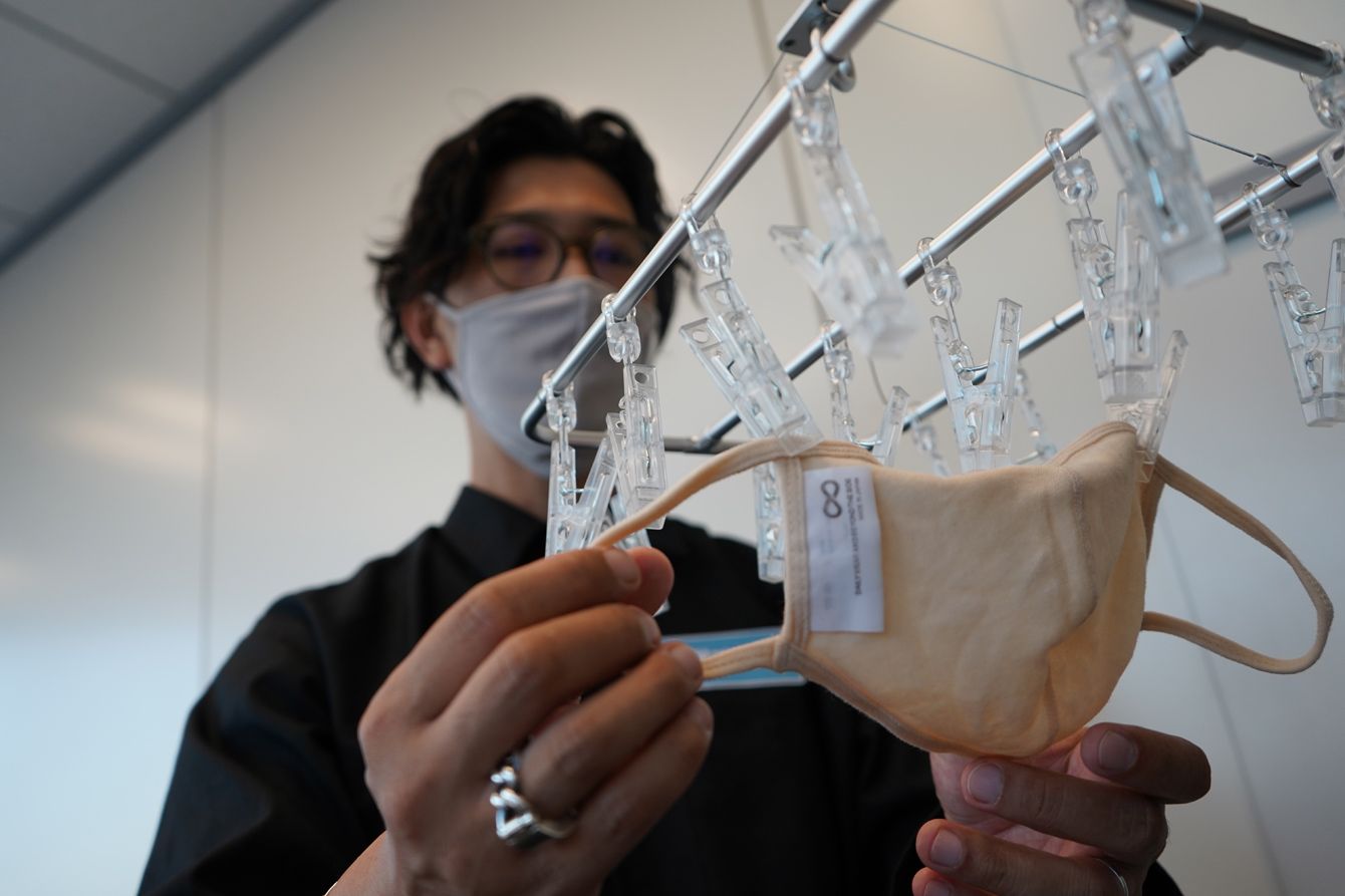 マスクを干す茂木康之氏。マスクをしっかり広げて干せば3、4時間で乾く