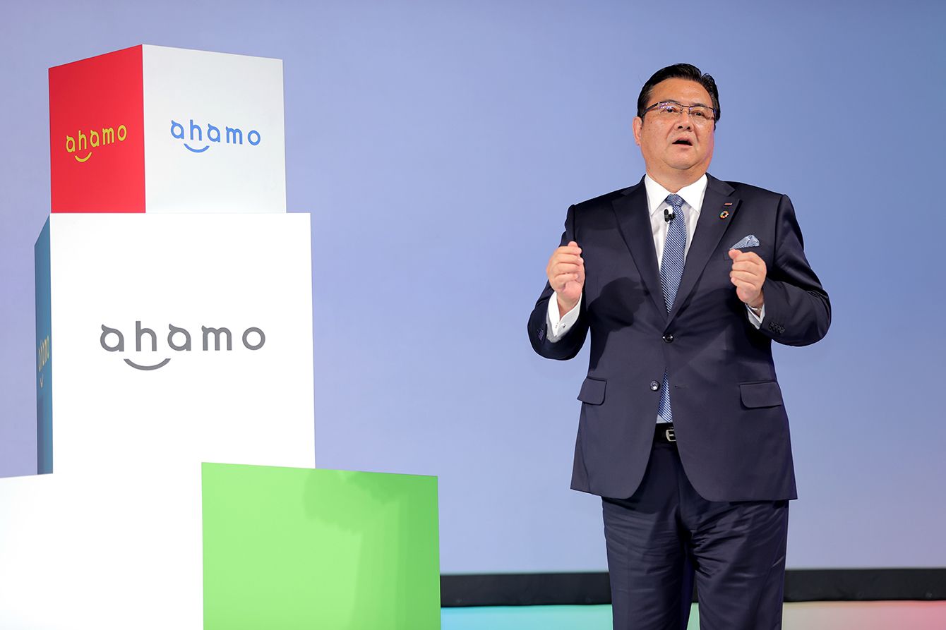 データ通信容量20ギガバイトで月額2980円の新料金プラン「ahamo(アハモ)」を発表するNTTドコモの井伊基之社長=2020年12月3日、東京都渋谷区