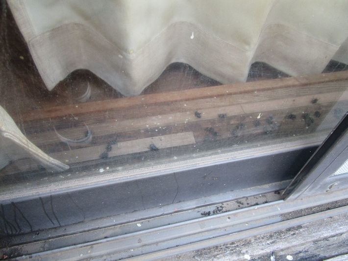 窓ガラス越しからも大量のハエの死骸が見えていた。