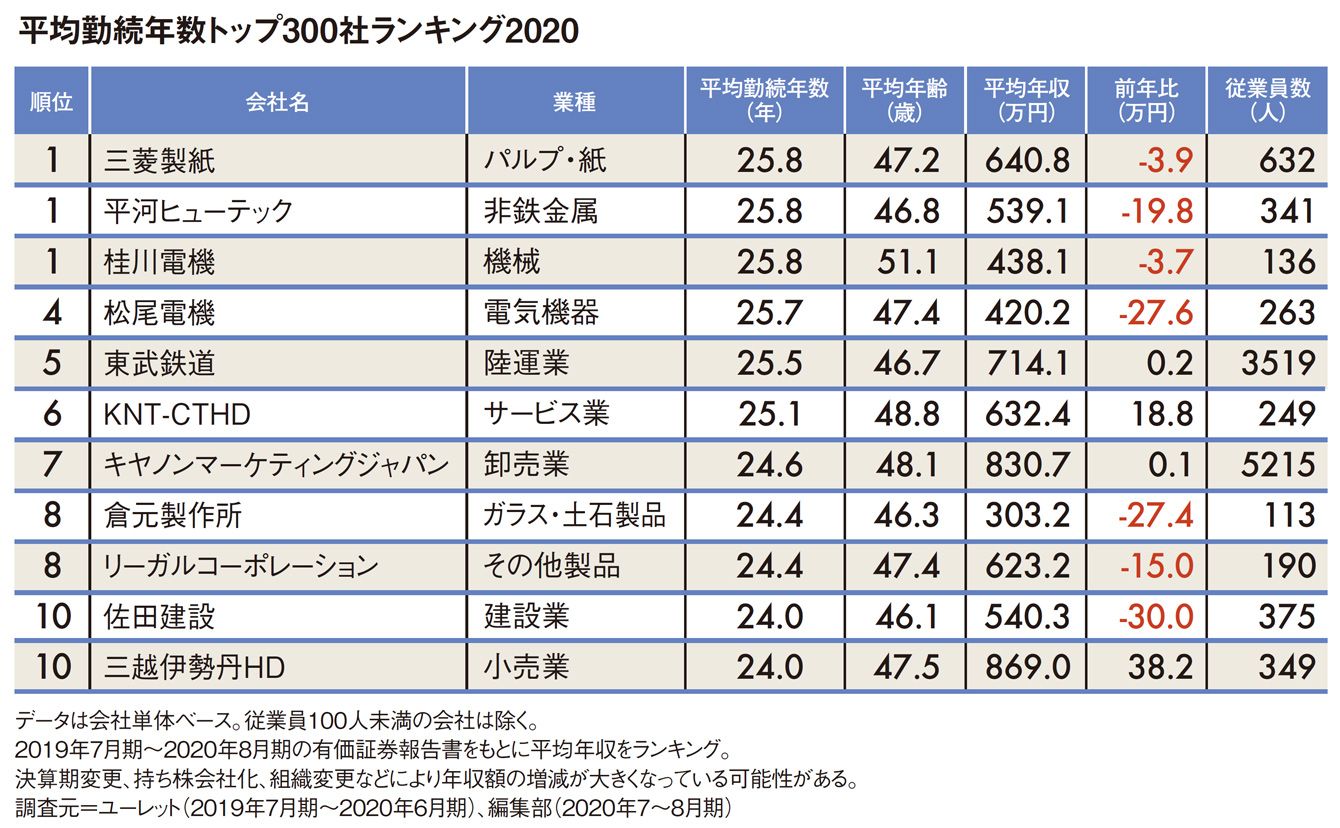「1位は三菱製紙の25年超」平均勤続年数トップ300社ランキング2020