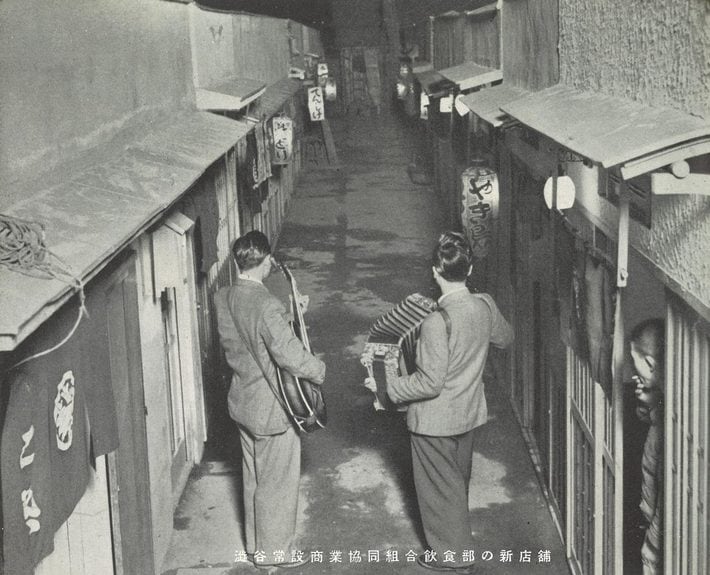昭和25~27年に撮られたのんべい横丁と思われる1枚。現在は2階建てだが、この頃は平屋。流しの姿もある。(※注)