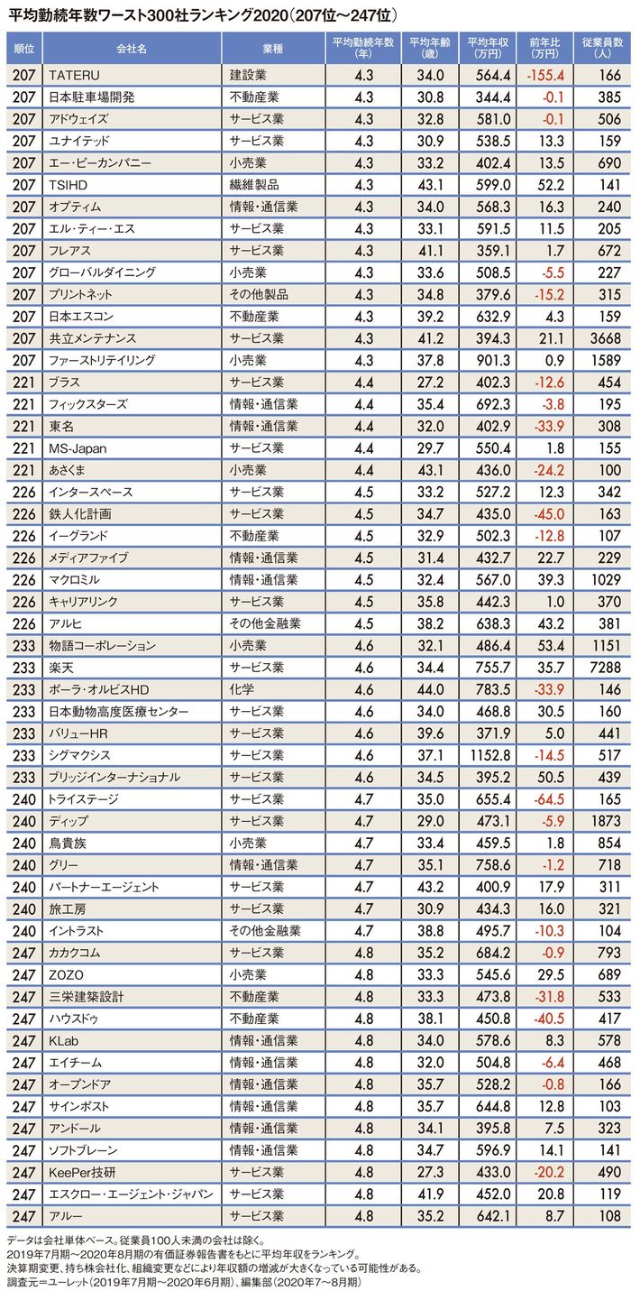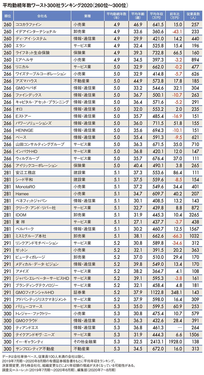 「1位は0.7年」平均勤続年数ワースト300社ランキング2020